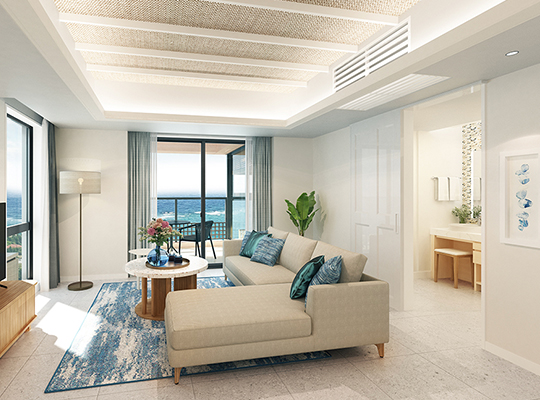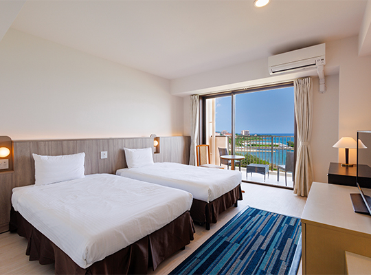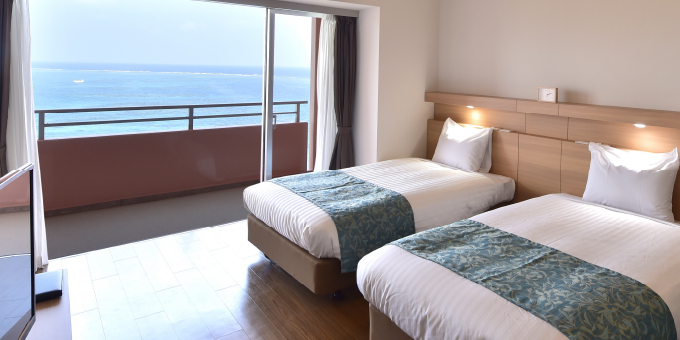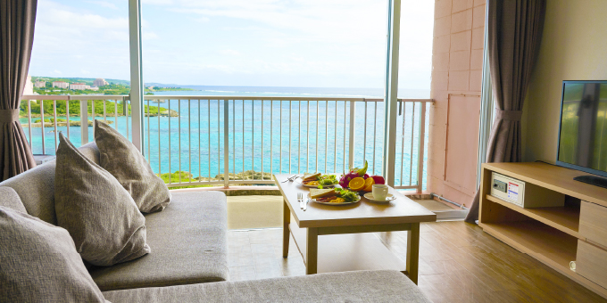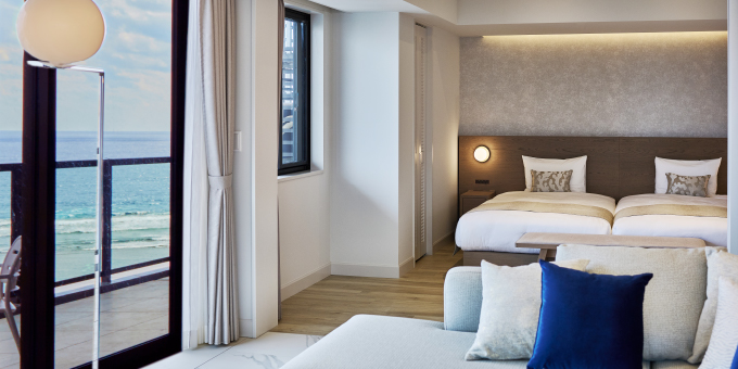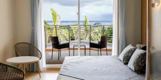 從房內即可俯瞰宮古島南側海岸線,盡覽迷人的宮古藍海景。安心預訂此房型,每一間皆為海景客房,於露台悠然欣賞海天相接的壯麗景致,盡情感受宮古島的悠閒度假氛圍。