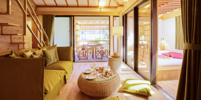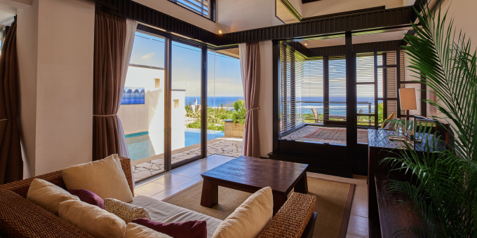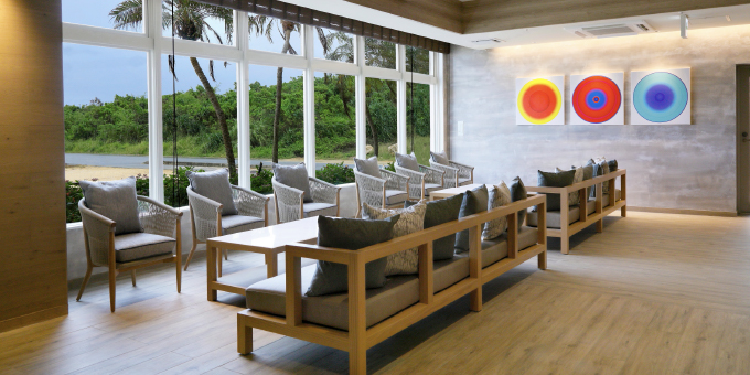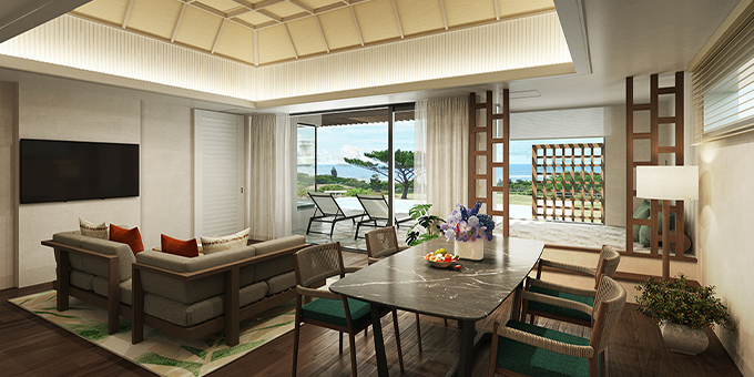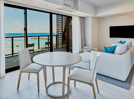 「Beachfront 臨海棟」擁有寬敞的起居與餐飲空間,並設有便利廚房,讓您在宮古島享受宛如度假別墅般自在奢華的假期。